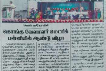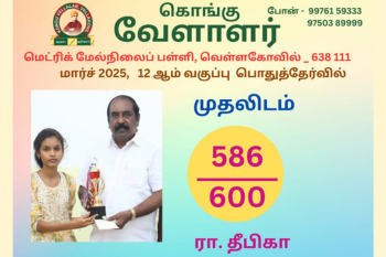 திருப்பூர் மாவட்ட அளவில் நடைபெற்ற சதுரங்க போட்டியில் கொங்கு வேளாளர் மெட்ரிக் மேல்நிலைப்பள்ளி மாணவர்கள் S. ஸ்ரீ ஹரி கேஸ் (I.A), S. ஸ்ரீ பிரணவ் (II.B,) M .அனீஸ் ஆதித்யா (III.A ) போட்டியில் கலந்து கொண்டு வெற்றிபெற்றமைக்காக பள்ளியின் தாளாளர் மற்றும் முதல்வர் பரிசுகளை வழங்கி மாணவர்களை பாராட்டினர்.